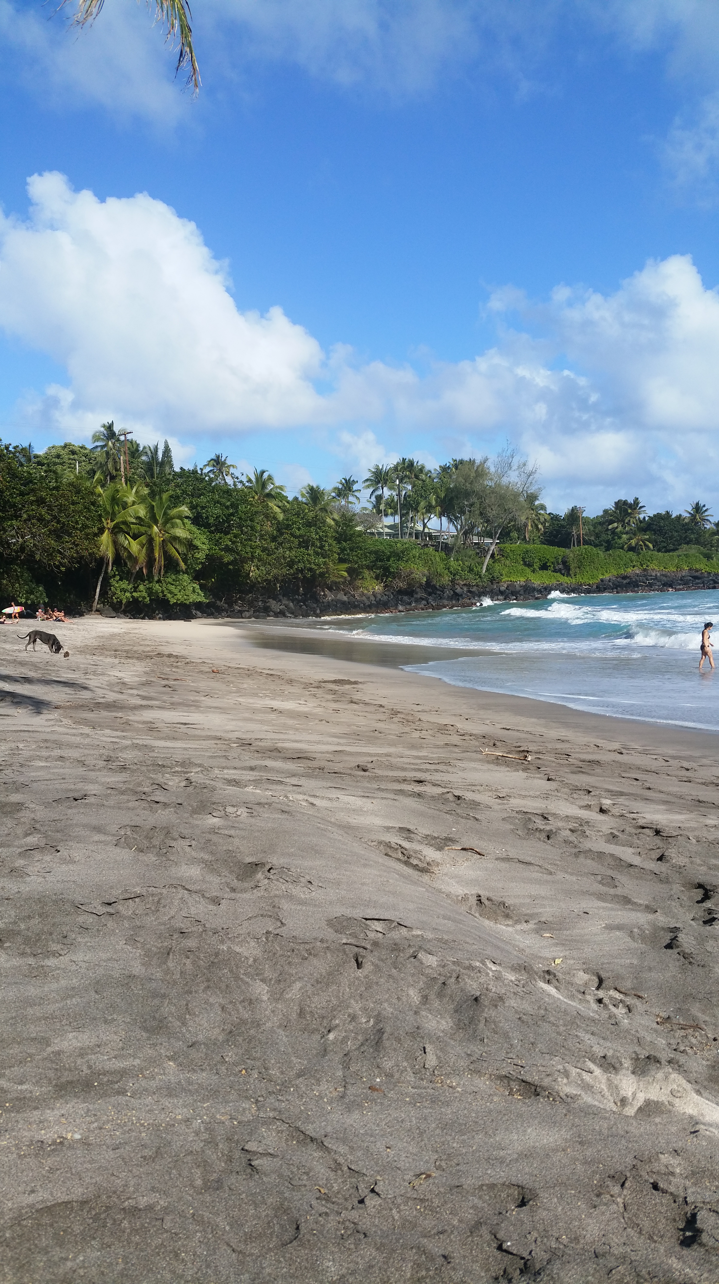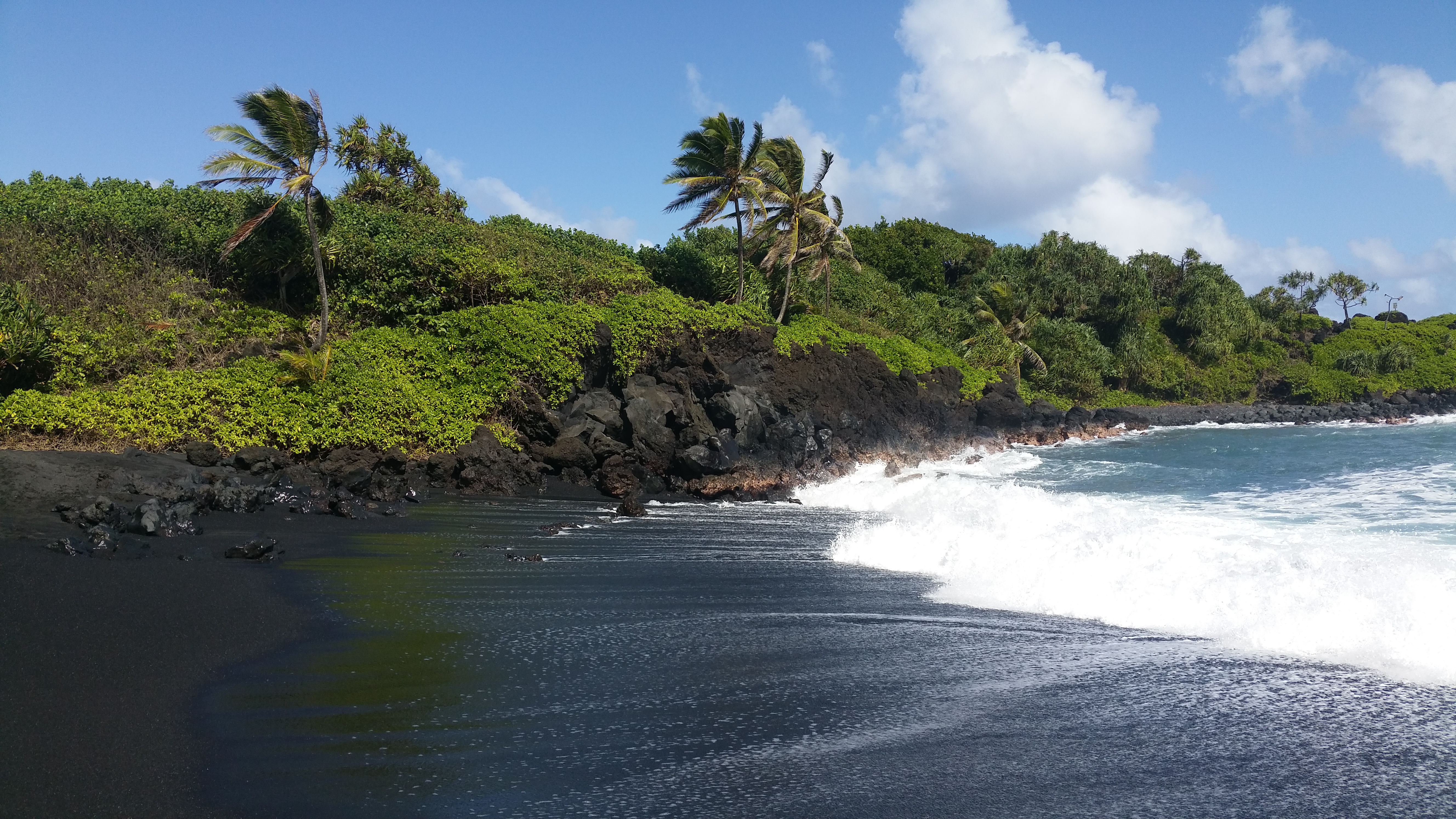 Plus loin sur la route, après le village d’Hana, vous aurez la possibilité de vous aventurer sur un petit chemin (Haneo’o Road, juste avant le mile marker 50) vous menant à une plage de sable couleur chocolat. Koki Beach est presque déserte car hors du circuit de la route principale. La plage est un véritable coin de paradis! Une image en dit plus que mille mots, je vous laisse donc juger par vous-même.